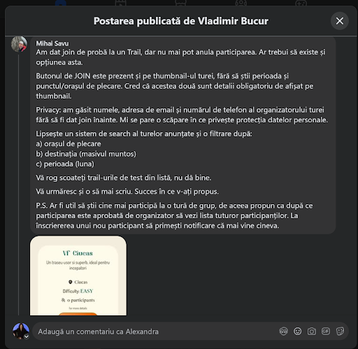 Campania de promovare a generat un interes imediat. Utilizatorii au început să interacționeze cu postările și să acceseze platforma, validând nevoia unei soluții organizate pentru drumeții. Un indicator important al intenției de plată a fost întrebarea directă a utilizatorilor despre costurile serviciului.